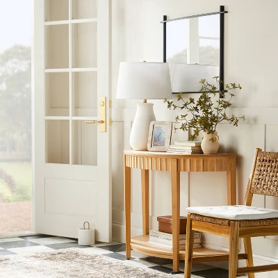 Enhance your space in sleek style with this Cross Corner Metal Wall Mirror with EPS from Threshold™ designed with Studio McGee. The cross corner wall mirror features a rectangular design with 24-inch width to cover a larger portion of the wall and create a brighter and more open feel to any room. The mirror is encased by a metal frame and comes with a wall mount so you can easily hang it on any wall. Whether hung in the entryway or living room, this decorative wall mirror instantly makes your interiors more inviting.