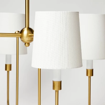 Bring a statement look to your indoor lighting with this 4-Arm Chandelier from Threshold™ designed with Studio McGee. Made from metal in a gold-tone finish, this four-arm chandelier features four crisp white shades for a modern look that easily complements your existing decor. This shaded chandelier offers an adjustable hanging height to fit your space, and lights up with a one-way light setting for easy operation. Whether you hang it in your living room, over your dining room table or suspend it above the kitchen island, this chandelier makes a stylish addition to your indoor space.