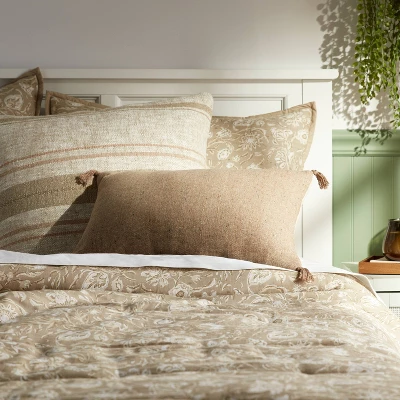 Lend a touch of warmth and style to your interior decor with the Oblong Traditional Tweed Decorative Throw Pillow from Threshold™. This oblong throw pillow features a natural brown tweed on one side and solid beige on other side for a two-tone look. The soft wool blend offers comfort and warmth and it’s recommended for indoor use. Place this tweed throw pillow on your bed or couch to complete the look of your space.