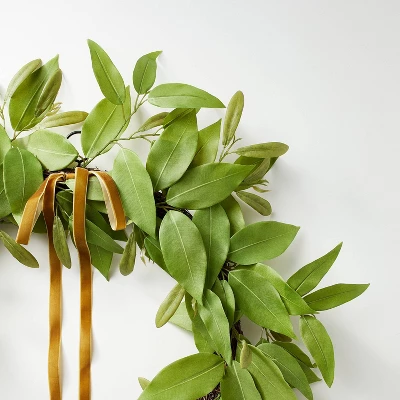 Give a welcoming look to your empty walls with this Oversized Fall Leaf Wreath with Velvet Ribbon from Threshold™ designed with Studio McGee. Adorned with green faux eucalyptus leaves in an oversized 30-inch circle and topped off with a brown velvet ribbon bow with trailing ties, this artificial wreath adds a refined touch to your home decor. Plus, the lightweight construction and top hanging loop make for easy display. Hang it above your fireplace, on the living room wall or on your front door to celebrate the coming of fall.